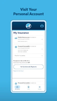 • Pay your bills • Set up and manage automatic payments • Request roadside assistance • Submit a glass claim • Check claim status and view claim documents and history • Access your insurance ID cards and policy documents • Get temporary proof of insurance for a newly acquired vehicle • Manage how you receive documents, including paperless options • Update your texting preferences and choose how you receive important alerts