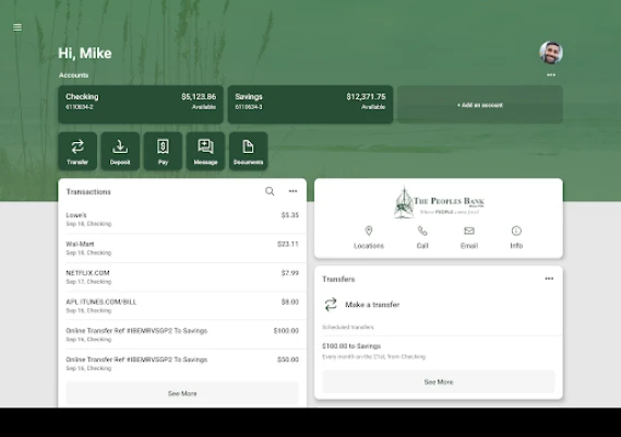 Here’s what you can do with Peoples Green2Go: -Keep your transactions organized by allowing you to add tags, notes and photos of receipts and checks. -Set up alerts so you know when your balance drops below a certain amount -Make payments, whether you’re paying a company or a friend -Transfer money between your accounts -Deposit checks in a snap by taking a picture of the front and back -Reorder your debit card or turn it off if you’ve misplaced it -View and save your monthly statements -Find branches and ATMs near you